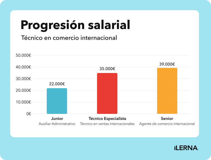 El Grado Superior en Comercio Internacional abre las puertas a un sector muy bien pagado, según portales como Glassdoor el sueldo puede llegar hasta los 36 mil euros brutos. A medida que se gana experiencia y especialización el sueldo crece exponencialmente, con una curva salarial ascendente.
